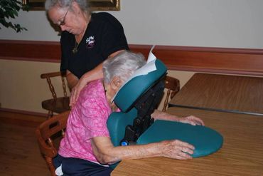 We offer both on site chair massage and table massages. A chair massage is a relaxing, gentle massage that focuses on the neck, shoulders, arms, and back. In less than 20 minutes, each person senses a deep level of relaxation. A table massage is of longer duration, sometimes around an hour, and the focus is on the entire body. We will work with you to determine which type of massage is most appropriate for you, your residents, facility, office, or event.